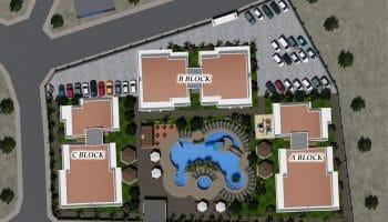 ЖК будет состоять из трех шестиэтажных зданий, расположенных на собственной просторной территории. Инфраструктуру комплекса составит бассейн с детской секцией и аквапарком, бар у бассейна, беседки, зона отдыха с мангалами, детская площадка и парковка. Внутри комплекса проектом предусмотрен фитнес-центр, хамам и сауна.