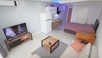 Наша квартира находится на втором этаже, ее площадь 47 кв метров. Квартира полностью укомплектована всем необходимым для отдыха, есть кондиционер, оборудованный кухонный уголок с бытовой техникой, двуспальная кровать и раскладывающийся диван. Посуда, полотенца, постельные принадлежности также присутствуют.