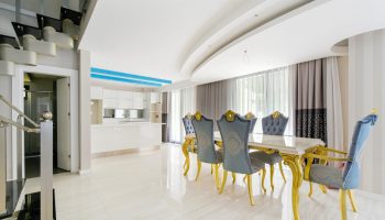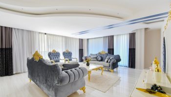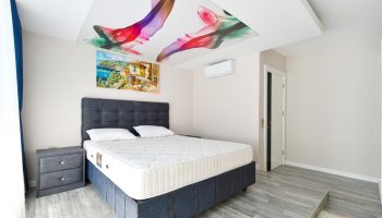 4+1: гостиная с кухонной зоной, 4 спальни, 3 ванных, туалет, балкон и терраса во всю стену здания. Площадь 150 кв.м.