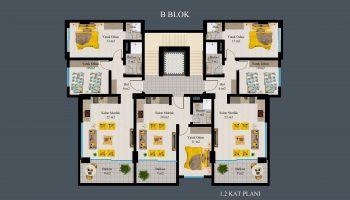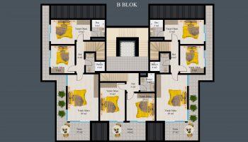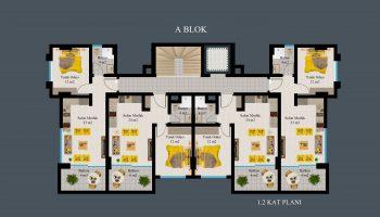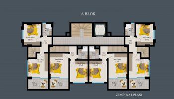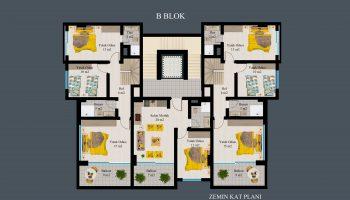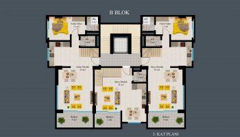 2+1: гостиная, совмещенная с кухней, две спальни, ванная, туалет и балкон. Площадь 78 кв.м.