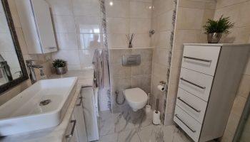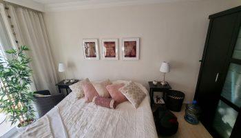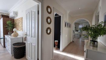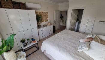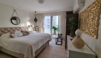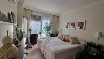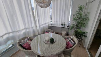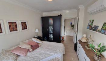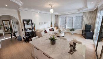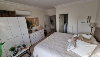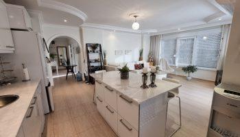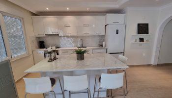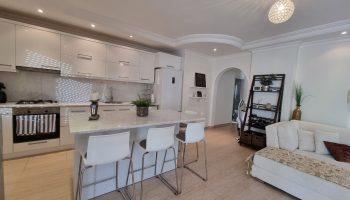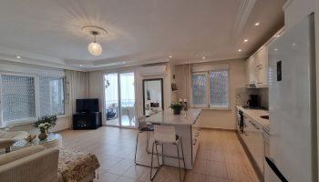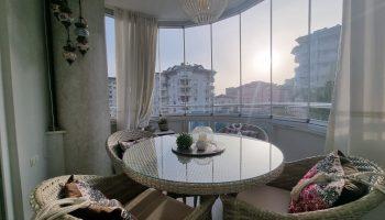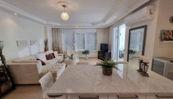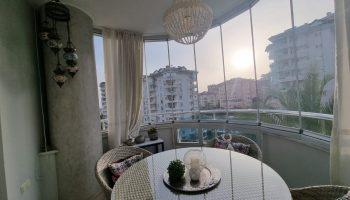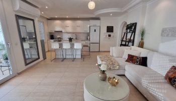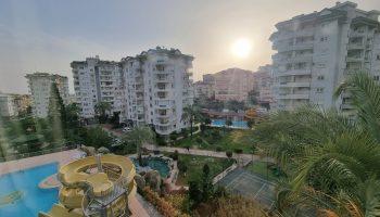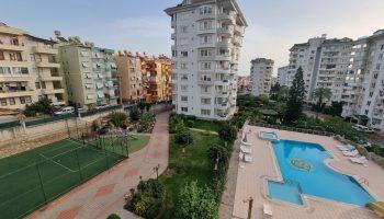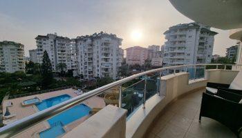 Площадь квартиры 120 м2. Имеет два балкона и две ванных комнаты. Квартира продается с мебелью, оснащена укомплектованным санузлом и кухонным гарнитуром, а также бытовой техникой. Квартира имеет планировку 2+1 (две спальни и гостиную, которая совмещена с кухней, американского типа). В апартаментах напольное покрытие плитка. С балкона, открывается вид на город, бассейн и окружающую природу. Расположена на 3 этаже.
