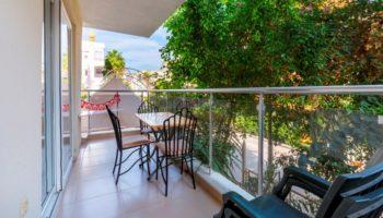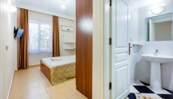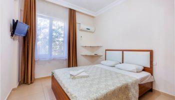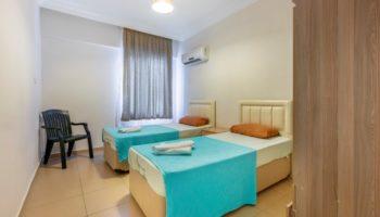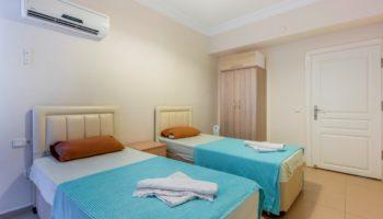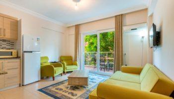 Апартаменты, планировкой 2+1 находятся на первом этаже, включают в себя: две спальных и ванных комнаты, гостиную, совмещенную с кухней и балкон.