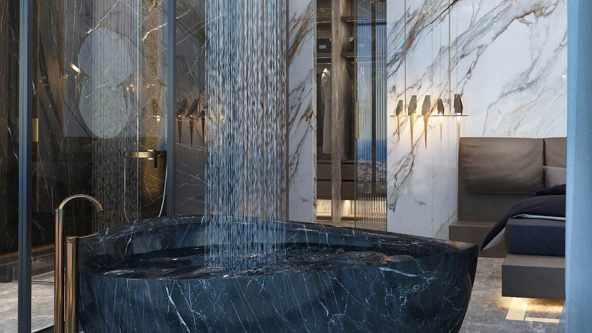 У каждой спальни есть собственная ванная комната с туалетом. В главной спальне стоит большая ванна с джакузи и панорамными окнами. В гостиной есть камин.