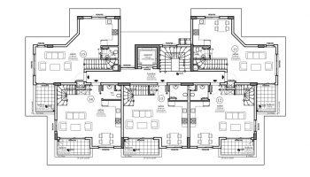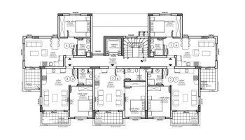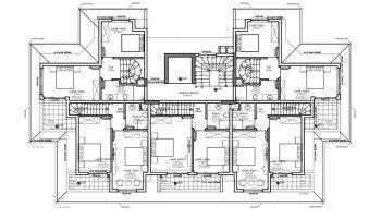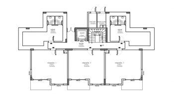 5 трехкомнатных дуплексов планировки 2+1 — две спальни, кухня- гостиная, две ванных комнаты, один балкон, одна терраса с выходом в сад, площадью 120 м2;