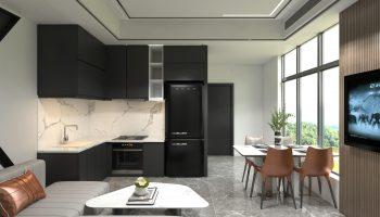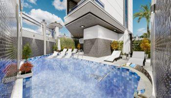 2+1 – пентхаусы, две спальных комнаты, гостиная совмещенная с кухней, 3 санузла и 2 балкона. Пентхаус двухуровневый, на первом этаже – кухня-гостиная, ванная комната и балкон, на втором две спальных комнаты с индивидуальными ванными и балкон.