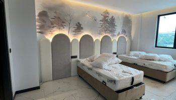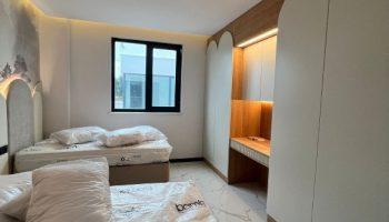 Площадь двухэтажных вилл будет составлять 155 м2. На первом этаже будет размещена кухня, совмещенная с гостиной, ванная комната, спальная комната с собственной ванной комнатой, и выход на террасу, на втором этаже размещено две спальных комнаты, каждая из которых имеет собственную ванную комнату, и балкон.