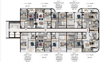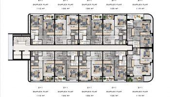 дуплексы и садовые дуплексы 2+1 – двухуровневые, на первом уровне кухня, совмещенная с гостиной, ванная комната, выход на террасу, в сад, на втором уровне – две спальных комнаты, две ванных комнаты.