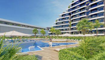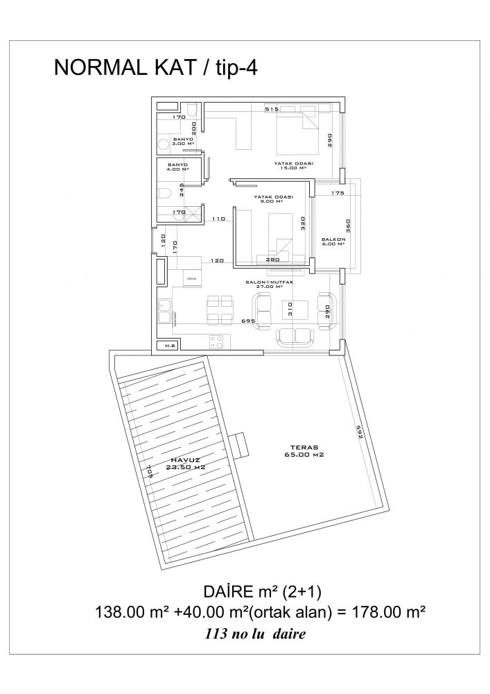 Дуплексы 2+1 – подразумевают под собой на первом уровне две спальных комнаты, ванную комнату, бассейн и террасу, на втором уровне гостиную, совмещенную с кухней, американского типа, ванную комнату и террасу.