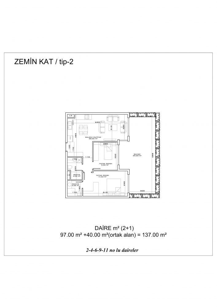 Апартаменты 2+1 – подразумевают под собой две спальных комнаты, две ванных комнаты, гостиную, совмещенную с кухней, американского типа и сад.