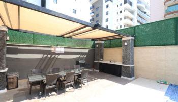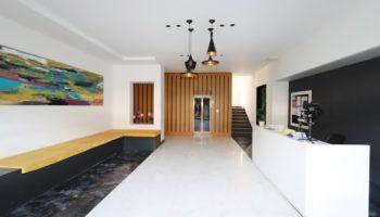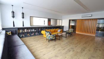 Пентхаус расположился на 4 и 5 этажах комплекса, имеет площадь брутто 130 кв.м. и планировку 2+1. На входном верхнем этаже расположилась прихожая, гостевой санузел, кухня американского типа совмещенная с гостиной, просторная терраса. На этаже ниже находятся две спальни, еще одна ванная комната, терраса.