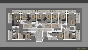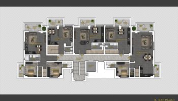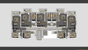 двухуровневые пентхаусы 4+1 подразумевают под собой на первом уровне кухню, совмещенную с гостиной американского типа, спальную комнату, две ванных комнаты и две террасы; на втором уровне три спальных комнаты, три ванных комнаты и четыре террасы.