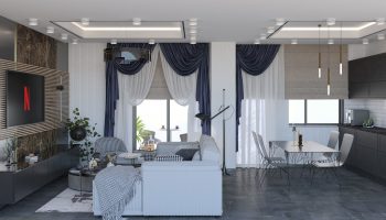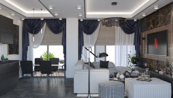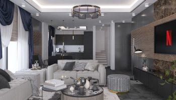 В стоимость входит чистовая отделка: керамическая плитка, кухонный гарнитур с гранитной рабочей поверхностью, стальная входная дверь с тройным замком, двойные панорамные стеклопакеты, полностью укомплектованные ванные комнаты, декоративные подвесные потолки, встроенное точечное освещение, инсталляция под установку кондиционеров, инсталляция под установку проточного водонагревателя.