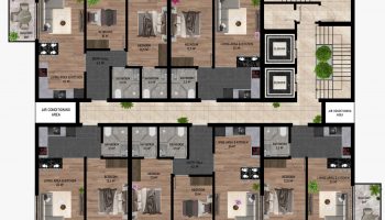 двухуровневые пентхаусы 3+1 подразумевают под собой на первом уровне кухню, совмещенную с гостиной американского типа, спальную комнату, ванную комнату и террасу; на втором уровне две спальных комнаты, две ванных комнаты и две террасы.
