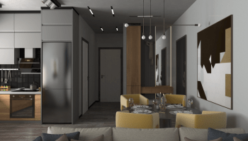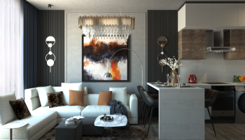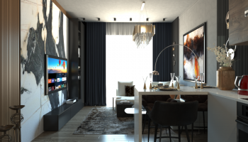 апартаменты 1+1 подразумевают под собой спальню и кухню, совмещенную с гостиной американского типа, ванную комнату и лоджию.