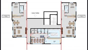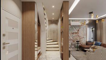 Дуплекс 2+1 — подразумевающий под собой на первом уровне гостиную, совмещенную с кухней американского типа, ванную комнату и террасу, на втором уровне две спальные комнаты, ванную комнату и террасу.