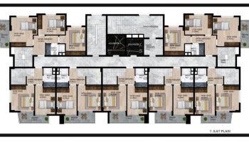 Апартаменты 2+1 – состоящие из двух спальных комнат, гостиной соединенной с кухней американского типа, ванной комнаты и террасы.