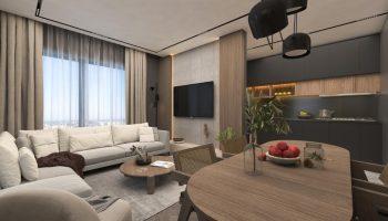 Апартаменты площадью 85 м2 расположены на 7 этаже, имеют планировку 2+1 подразумевающую под собой две спальных комнаты, гостиную, совмещенную с кухней американского типа, две ванных комнаты и террасу.