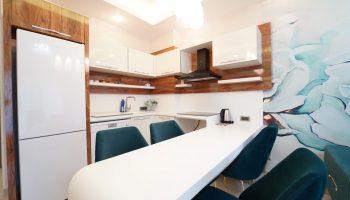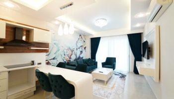 Апартаменты расположены на 5 этаже, имеют площадь 75 м2. Планировка 1+1 подразумевает под собой спальную комнату, гостиную которая совмещена с кухней американского типа, ванную комнату и террасу. Продаются полностью укомплектованными мебелью, бытовой техникой, кухонным гарнитуром с гранитной рабочей поверхностью и ванной комнатой. Напольное покрытие высококачественная керамическая плитка. В апартаментах сделан дизайнерский ремонт.