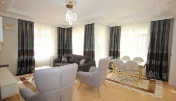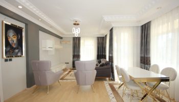 Площадь апартаментов 100 м2, расположены на 3 этаже. Планировка 2+1 подразумевает две спальных комнаты, гостиную совмещенную с кухней, ванную комнату и три террасы.