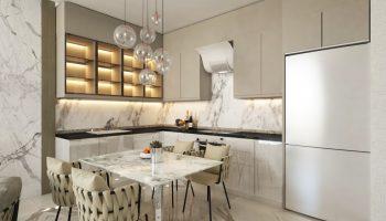 В стоимость входит чистовая отделка: керамическая плитка высшего качества на полах, кухонный гарнитур с гранитной рабочей поверхностью, стальная входная дверь, двойные панорамные стеклопакеты, полностью укомплектованные ванные комнаты, и др.