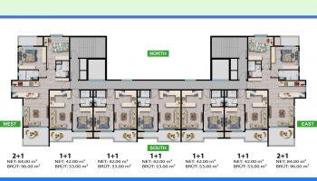 Жилой комплекс предлагает различные варианты квартир, включая 1+1 и 2+1. Площадь квартир варьируется от 53 до 96 квадратных метров, предоставляя вам выбор в соответствии с вашими потребностями и предпочтениями. Новый жилой комплекс состоит из 14 этажей, что обеспечивает удобный доступ и прекрасные виды на море, горы, природу, бассейн и город. Жилой комплекс предоставляет современные и стильные интерьеры, созданные с использованием высококачественных материалов.