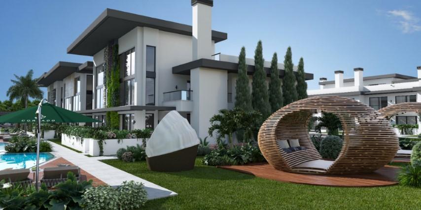 Комплекс состоит из 14 двухэтажных домов с панорамными окнами, которые позволяют наслаждаться прекрасным видом на окружающую природу и бассейн. В квартирах предусмотрены варианты с 3 спальнями и 2-3 ванными комнатами. Общая площадь квартир составляет 135 квадратных метров, а также имеются балконы с возможностью наслаждаться свежим воздухом и видом.