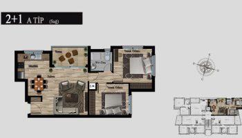 В состав жилого комплекса входят квартиры различных планировок. Варианты с 2 спальнями предлагают площадь 77 м² и 79 м², а также есть роскошный пентхаус с двумя спальнями, общая площадь которого составляет 150 м². Квартиры оборудованы солнечной системой нагрева воды, что позволяет снизить энергозатраты и делает их более экологически-ориентированными. Внутренний интерьер квартир выполнен в современном стиле с глянцевой кухней и столешницей из натурального мрамора. При отделке используются различные цветовые решения из керамики и дерева, что создает уникальный и стильный дизайн каждой квартиры.
