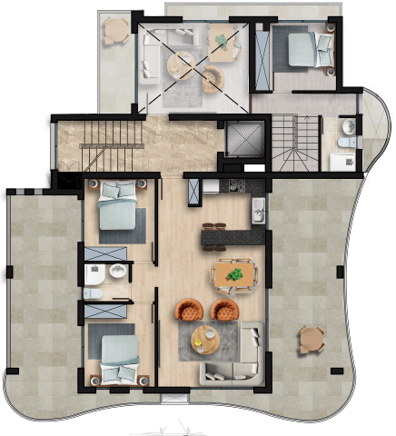 Комплекс состоит из 7 этажей и включает 18 квартир. В жилом комплексе предлагаются квартиры с 2 спальнями площадью от 70 м2 до 80 м2. Также в комплексе представлены двухуровневые апартаменты с 2 спальнями, площадью 92,5 м2 и 97 м2, что создает просторную и уникальную планировку. Кроме того, в комплексе предлагается роскошный пентхаус с 2 спальнями площадью 150 м2, который обеспечивает уникальные виды и высокий уровень комфорта.