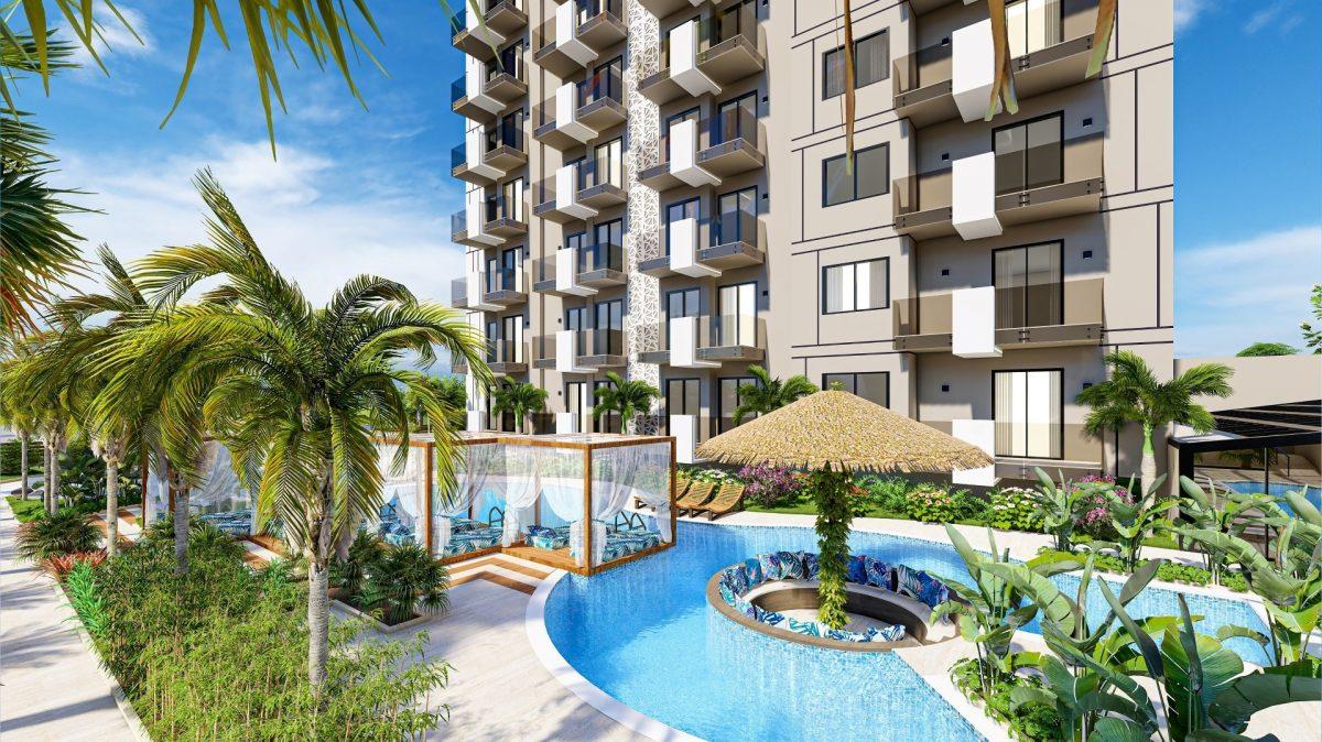 Жилой комплекс впечатляет своим современным и светлым дизайном, который создает атмосферу комфорта и стиля. Фасады зданий оформлены в нейтральных и пастельных тонах, которые подчеркивают чистоту и легкость дизайна. Оконные рамы и балконы также выполнены в светлых оттенках, что добавляет естественного света в интерьеры. Расположенная здесь однокомнатная квартира (1+1) с площадью 56 квадратных метров предоставляет уютное и современное жилье. Внутри вы найдете одну спальню и одну ванную комнату, оборудованные всем необходимым для вашего комфорта.