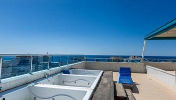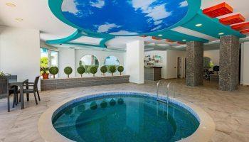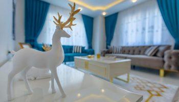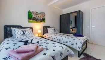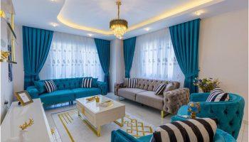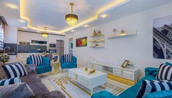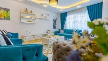 Четырехкомнатная планировка квартиры обеспечивает комфортное проживание. Интерьер отличается роскошью и элегантностью. Современная новая мебель, стильный дизайн с акцентным голубым цветом, золотыми и серебряными элементами создают уникальный и современный облик жилья. Два балкона позволяют наслаждаться свежим воздухом и прекрасными видами на природу и бассейн.