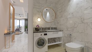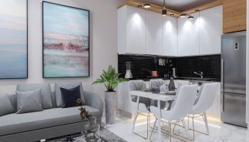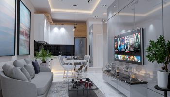 Квартира площадью 57 м² на первом этаже предлагает удобную планировку с одной спальней и просторной гостиной. Кухонный гарнитур укомплектован гранитной столешницей и стеклянным фартуком, что добавляет интерьеру изысканности и функциональности. Качественная сантехника и полностью оборудованная ванная комната с душевой кабиной устанавливают стандарты комфорта и стиля. Напольное покрытие из керамической плитки и видеодомофон обеспечивают как практичность, так и безопасность.