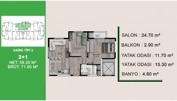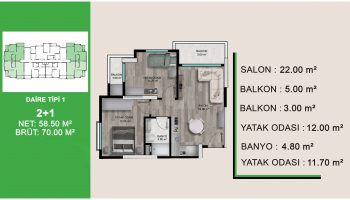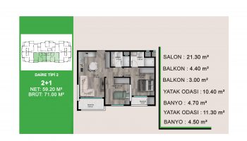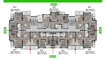 Каждая квартира в этом комплексе максимально функциональна и стильна, с площадями от 45 до 71 м². Интерьеры оснащены подвесными потолками, высококачественными кухонными шкафами и столешницами, а также роскошными душевыми кабинами и сантехникой первого класса. Гардеробные в каждой квартире добавляют удобства и практичности.