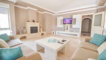 В гостиной установлен камин, который дарит не только тепло, но и уютную атмосферу. В одном из санузлов установлена ванная. На балконе второго этажа виллы, установлен навес и зона для отдыха откуда открывается вид на море.