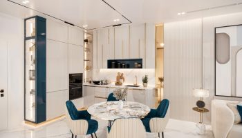 Архитектурный стиль проекта сочетает современные линии с акцентом на устойчивость и экологичность. Комплекс окружен зелеными насаждениями и безопасными семейными зонами. Открытая планировка интерьеров с использованием премиальных материалов и технологий обеспечивает ощущение простора и гармонии. Просторные балконы предлагают захватывающие виды на Дубай.