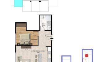 1+1: гостиная, совмещенная с кухней, спальная комната, ванная и балкон.