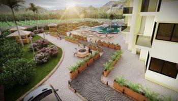 Жилой комплекс представляет собой 12-этажное здание с большой территорией, где будет сад с ландшафтным дизайном и прогулочными дорожками, открытый бассейн с аквапарком и детским неглубоким отделением, беседки для отдыха и барбекю, детская площадка и парковка.