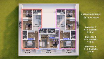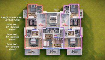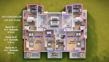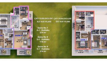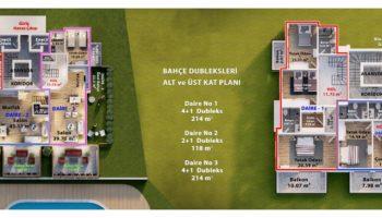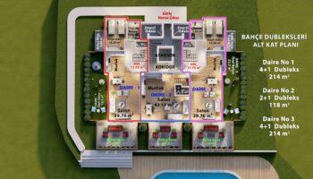 В комплексе представлены двухуровневые апартаменты с различной планировкой площадью 118 кв.м и 214 кв.м: