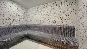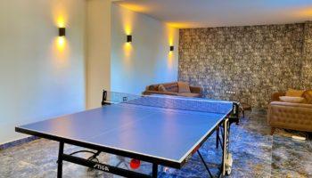 На территории компактно разместился бассейн, который на зиму будет закрываться стеклянной стеной и будет использоваться в зимнее время, есть детская площадка, место для барбекю. Внутри дома будет работать сауна и тренажерный зал.