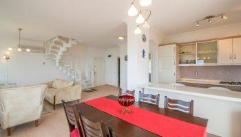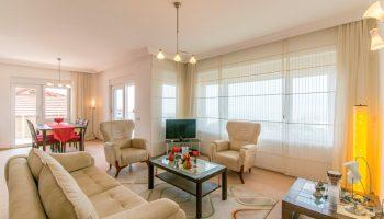 Меблированные апартаменты 3+1 (общей площадью 145 м²). Кухонная зона изолирована от гостиной. 2 ванных комнаты, 2 балкона. Второй и третий этажи, благодаря расположению на возвышенности, открывают невероятный вид на море, горы, город.