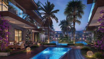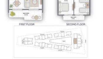 Инвестиционные апартаменты (Пентхаус) 4+1 (общей площадью 162 м²). Кухня объединена с гостиной. 3 ванных комнаты, 2 балкона. Вид на бассейн и сад. Прямой выход к собственному бассейну. Вид с первого и второго этажей открывается на море, горы, бассейн и город. Корпусная мебель в ванных и на кухне включена в стоимость объекта.